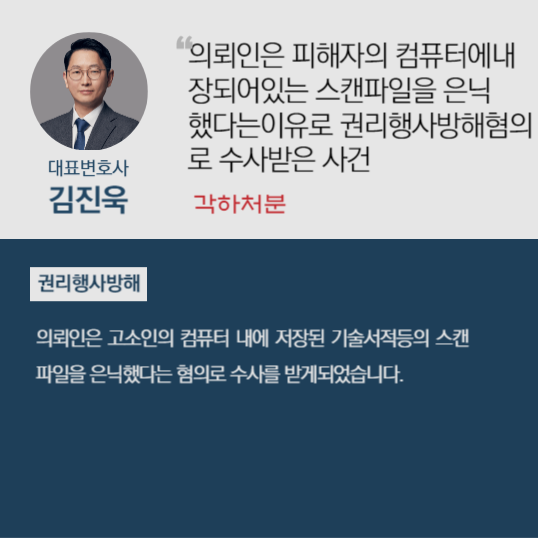 의뢰인은 불상의 장소에서 고소인의 권리의 목적이 된 컴퓨터 내에 저장된 기술서적 등의 스캔파일을 불상의 방법으로 은닉하여 고소인의 권리행사를 방해하였다는 혐의로 입건되었습니다.